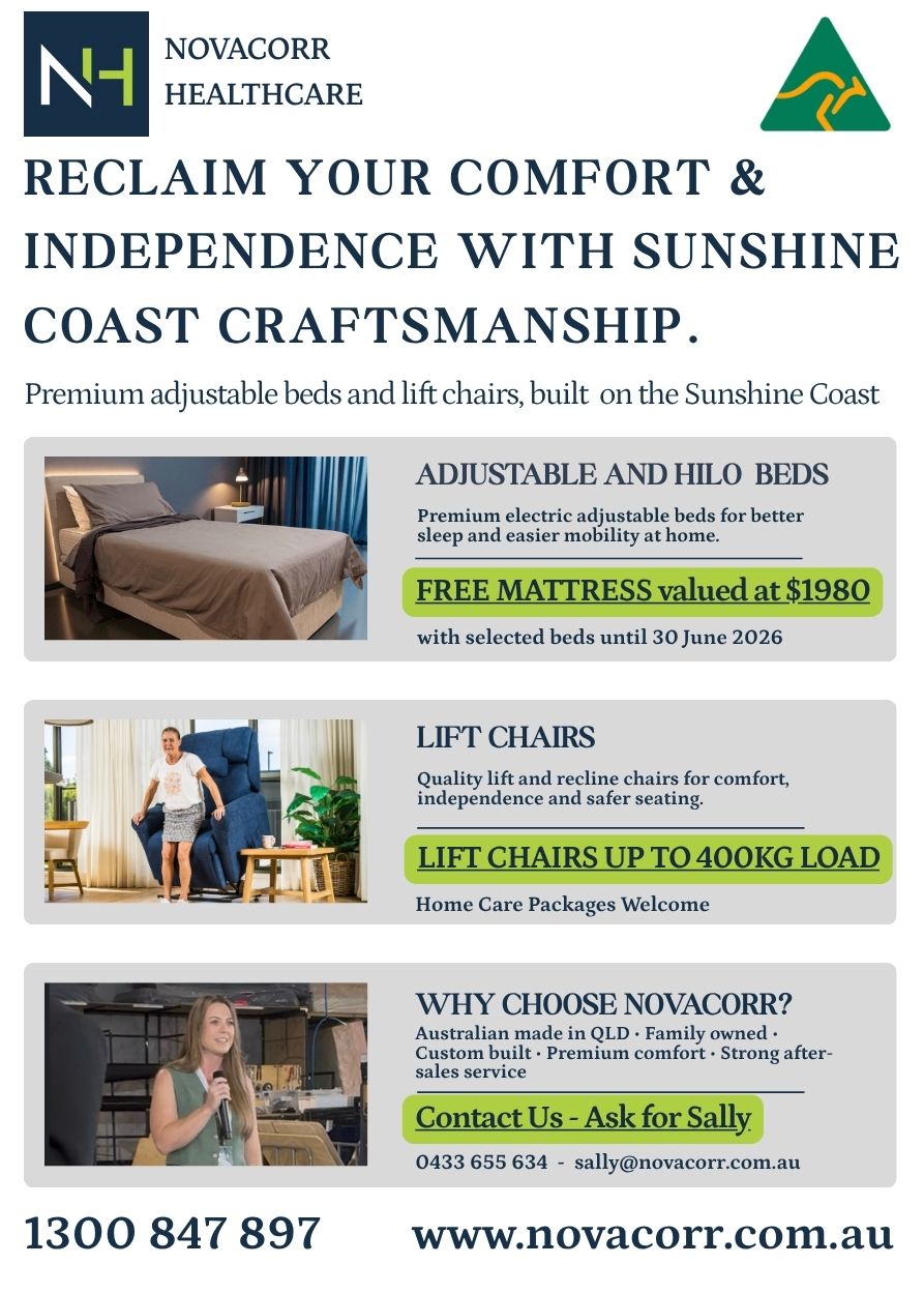 At Novacorr Healthcare, we design and manufacture premium adjustable beds and lift chairs right here on the Sunshine Coast. As a family-owned Australian manufacturer, we focus on practical comfort, safer mobility, and equipment that genuinely supports independence at home.